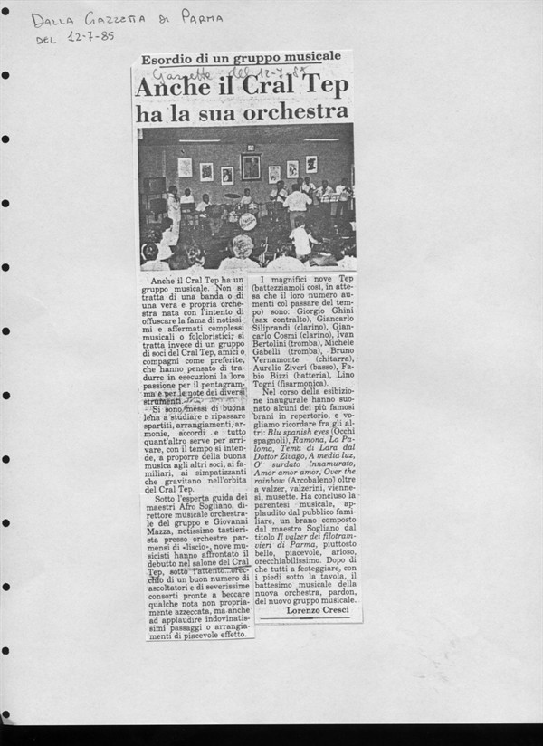 Scheda Inventario 831 Serie C Numero ordine 5 Anno 1985 Data 1985, 12-07 Autore Cresci, Lorenzo Editore SEGEA Periodicità Quotidiano Testata Gazzetta di Parma Soggettazione Iniziative Musica Orchestra