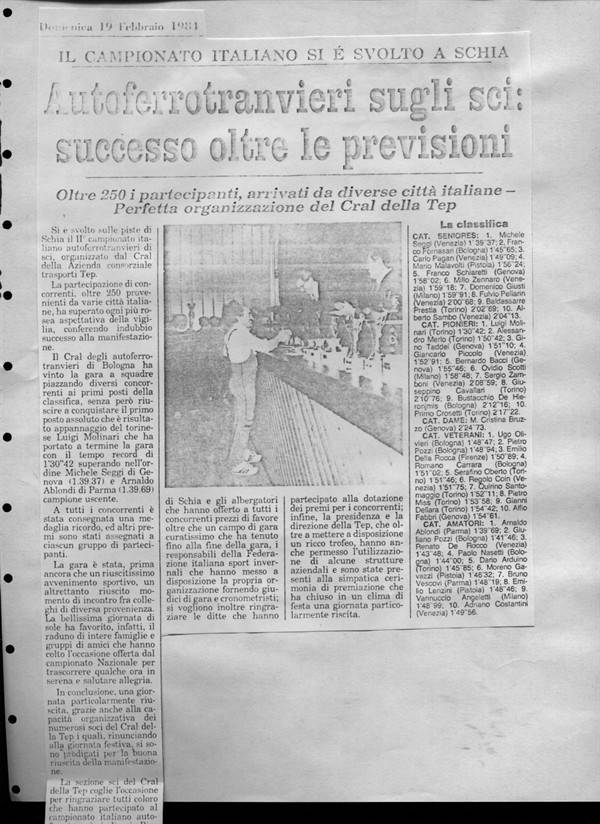 Autoferrotranvieri sugli sci: successo oltre le previsioni. Il campionato italiano si è svolto a Schia. Oltre 250 i partecipanti, arrivati da diverse città italiane. Perfetta organizzazione del Cral TEP.