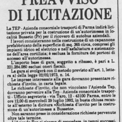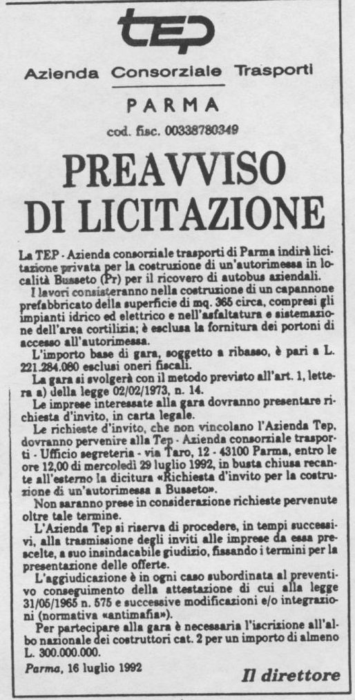Bando: La TEP indirà licitazione privata per la costruzione di un’ autorimessa in località Bussero.