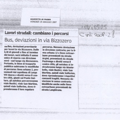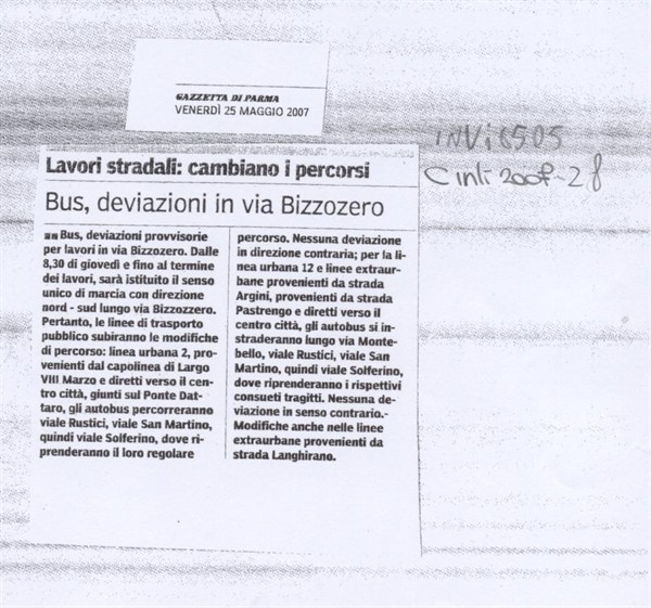 Scheda Inventario 6505 Serie C Numero ordine 28 Anno 2007 Data 2007, 25-05 Luogo Parma, via Bizzozzero Periodicità Quotidiano Testata Gazzetta di Parma Soggettazione Percorsi linee