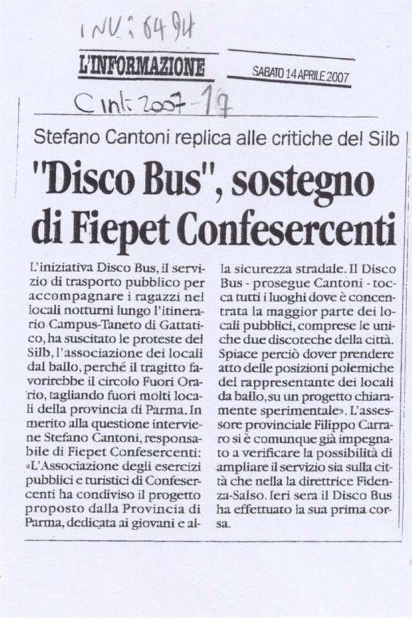 Scheda Inventario 6494 Serie C Numero ordine 17 Anno 2007 Data 2007, 14-04 Luogo Parma Periodicità Quotidiano Testata L'Informazione Soggettazione Disco Bus