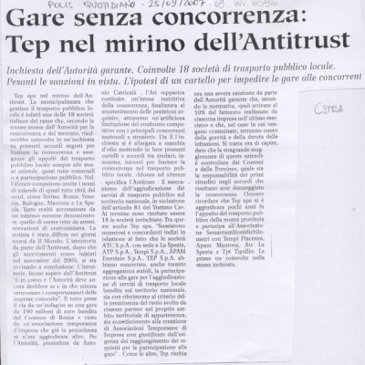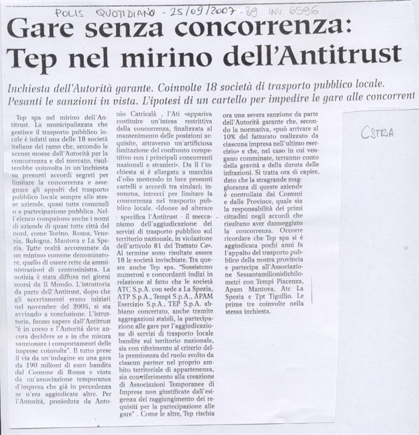 Scheda Inventario 6596 Serie C Numero ordine 89 Anno 2007 Data 2007, 25-09 Luogo Parma Autore - Periodicità Quotidiano Testata Polis Quotidiano Soggettazione Antitrust Indagini