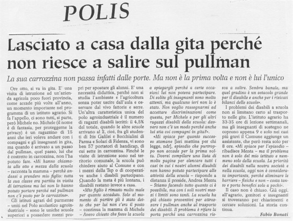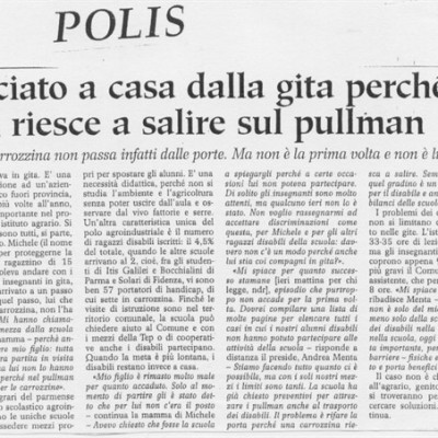 Lasciato a casa dalla gita perchè non riesce a salire sul pullman. La sua carrozzina non passa infatti dalle porte. Ma non è la prima volta e lui non è l’unico