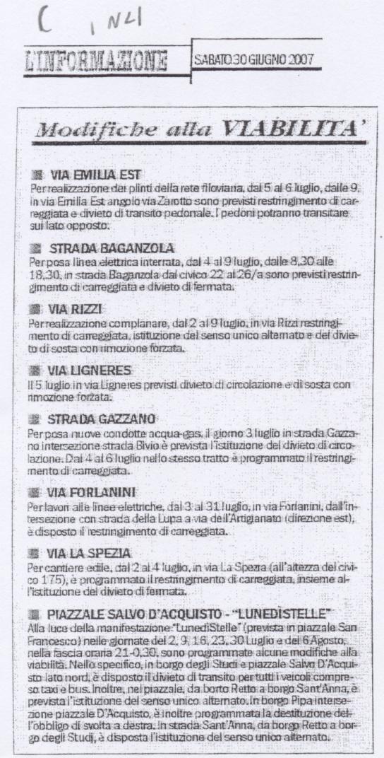 Scheda Inventario 6513 Serie C Numero ordine 38 Anno 2007 Data 2007, 30-06 Luogo Parma Autore - Periodicità Quotidiano Testata L'Informazione Soggettazione Viabilità Limitazione del traffico