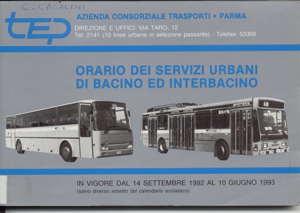 Orario dei servizi urbani di bacino ed interbacino in vigore dal 14 settembre 1992 al 10 giugno 1993