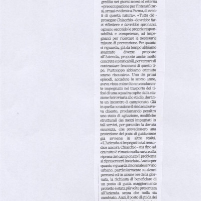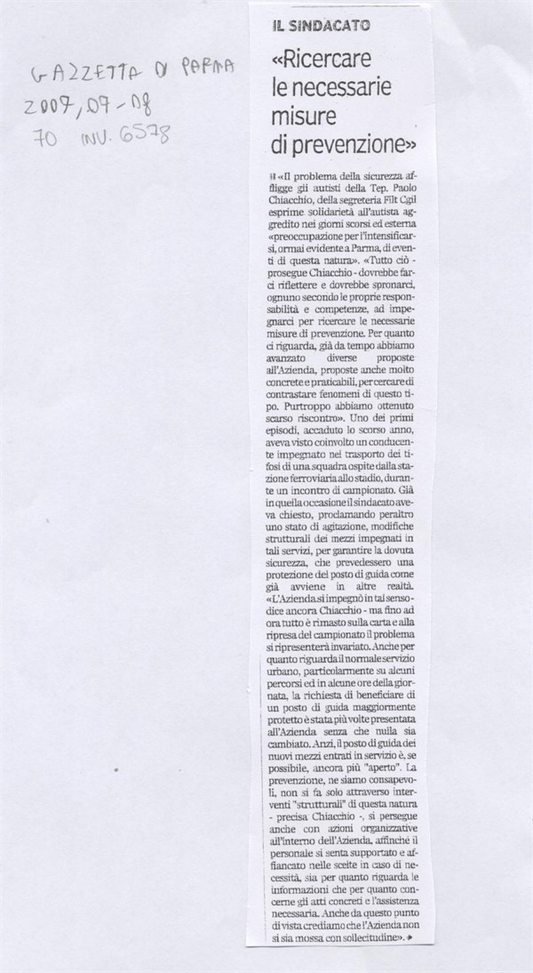 Scheda Inventario 6578 Serie C Numero ordine 70 Anno 2007 Data 2007, 07-08 Luogo Parma Autore - Periodicità Quotidiano Testata Gazzetta di Parma Soggettazione Sicurezza Vigilanza Trasporti pubblici