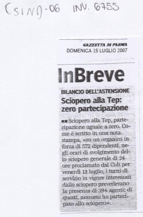 Scheda Inventario 6755 Serie C Numero ordine 6 Anno 2007 Data 2007, 15-07 Luogo Parma Autore - Periodicità Quotidiano Testata Gazzetta di Parma Soggettazione Scioperi