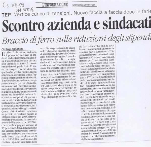 Scheda Inventario 6758 Serie C Numero ordine 9 Anno 2007 Data 2007, 08-08 Luogo Parma Autore Dallapina, Pierluigi Periodicità Quotidiano Testata L'Informazione Soggettazione Sindacato
