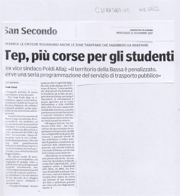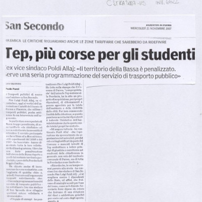 Scheda Inventario 6622 Serie C Numero ordine 115 Anno 2007 Data 2007, 21-11 Luogo San Secondo Autore Panni, Paolo Periodicità Quotidiano Testata Gazzetta di Parma Soggettazione Servizi Trasporto pubblico Piano mobilità