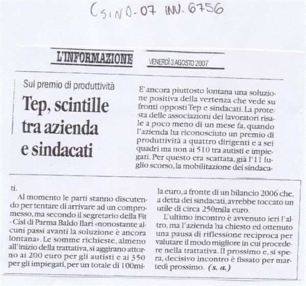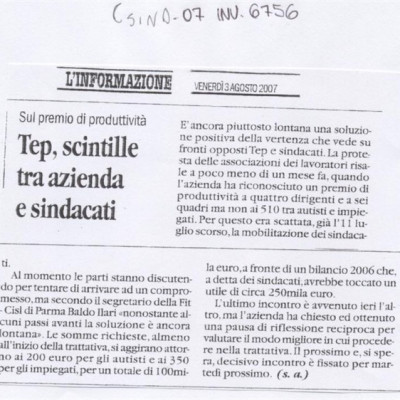 Scheda Inventario 6756 Serie C Numero ordine 7 Anno 2007 Data 2007, 03-08 Luogo Parma Autore S.A. Periodicità Quotidiano Testata L'Informazione Soggettazione Sindacato Consiglio d'Amministrazione