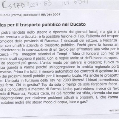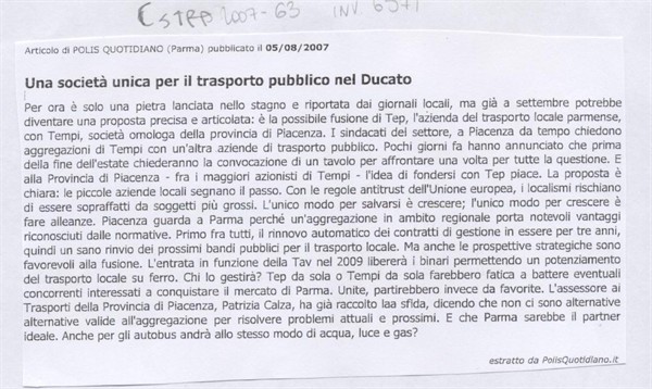 Scheda Inventario 6571 Serie C Numero ordine 63 Anno 2007 Data 2007, 05-08 Luogo Parma Autore - Periodicità Quotidiano Testata Polis Quotidaino Soggettazione Trasporti pubblici Sindacato