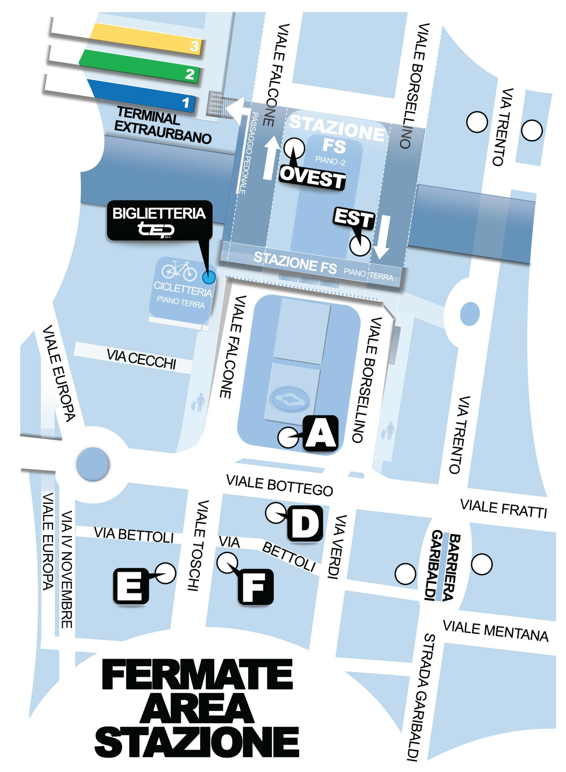 Tutti gli orari di partenza dal terminal extraurbano e gli orari di passaggio delle linee urbane prolungate al piano -2 della Stazione.