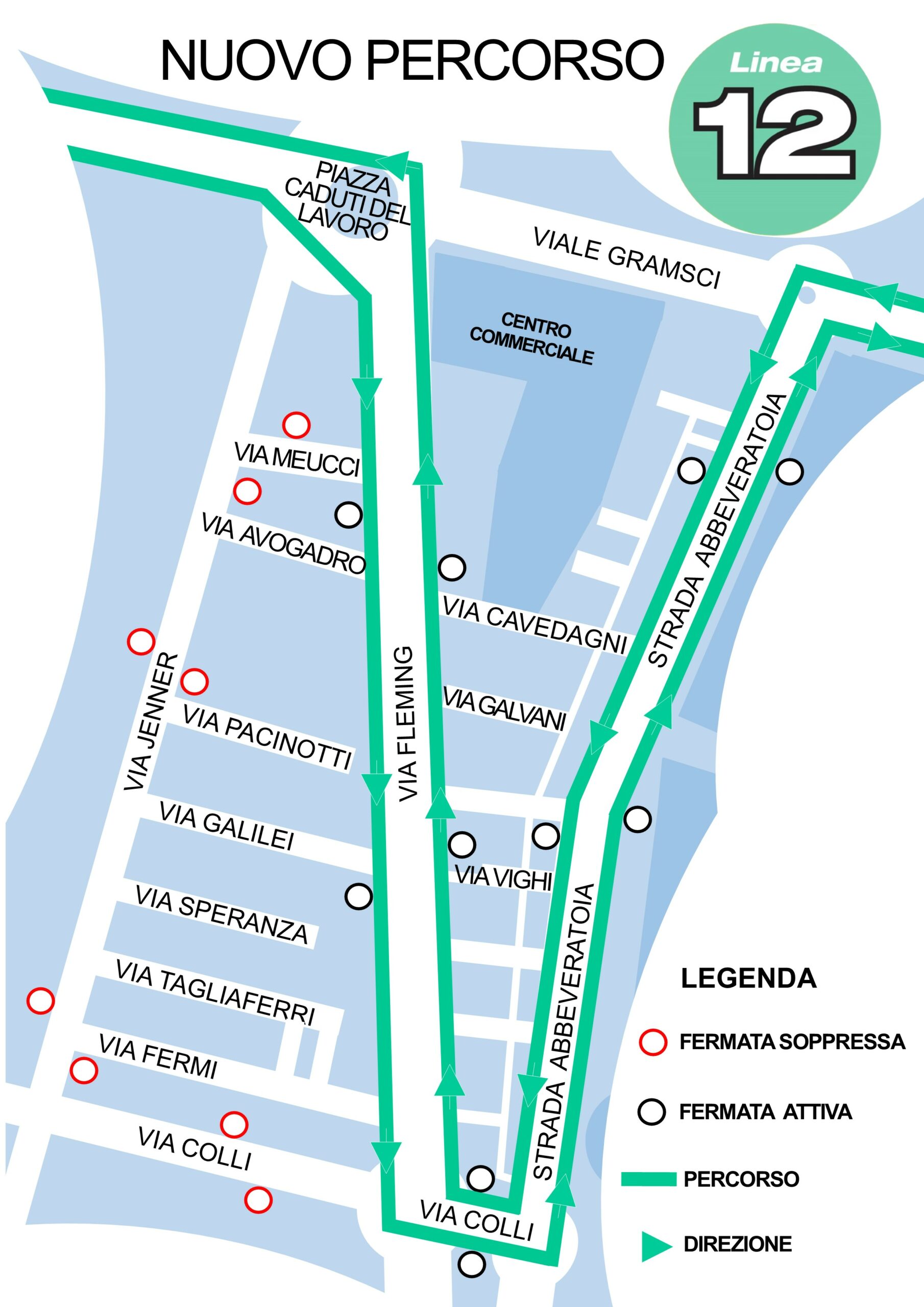 Dal 24 novembre il percorso della linea 12 sarà modificato per evitare i rallentamenti causati dalla chiusura del passaggio a livello tra via Mons. Colli e strada Valera di Sopra, che spesso genera code e difficoltà nella svolta su via Jenner.