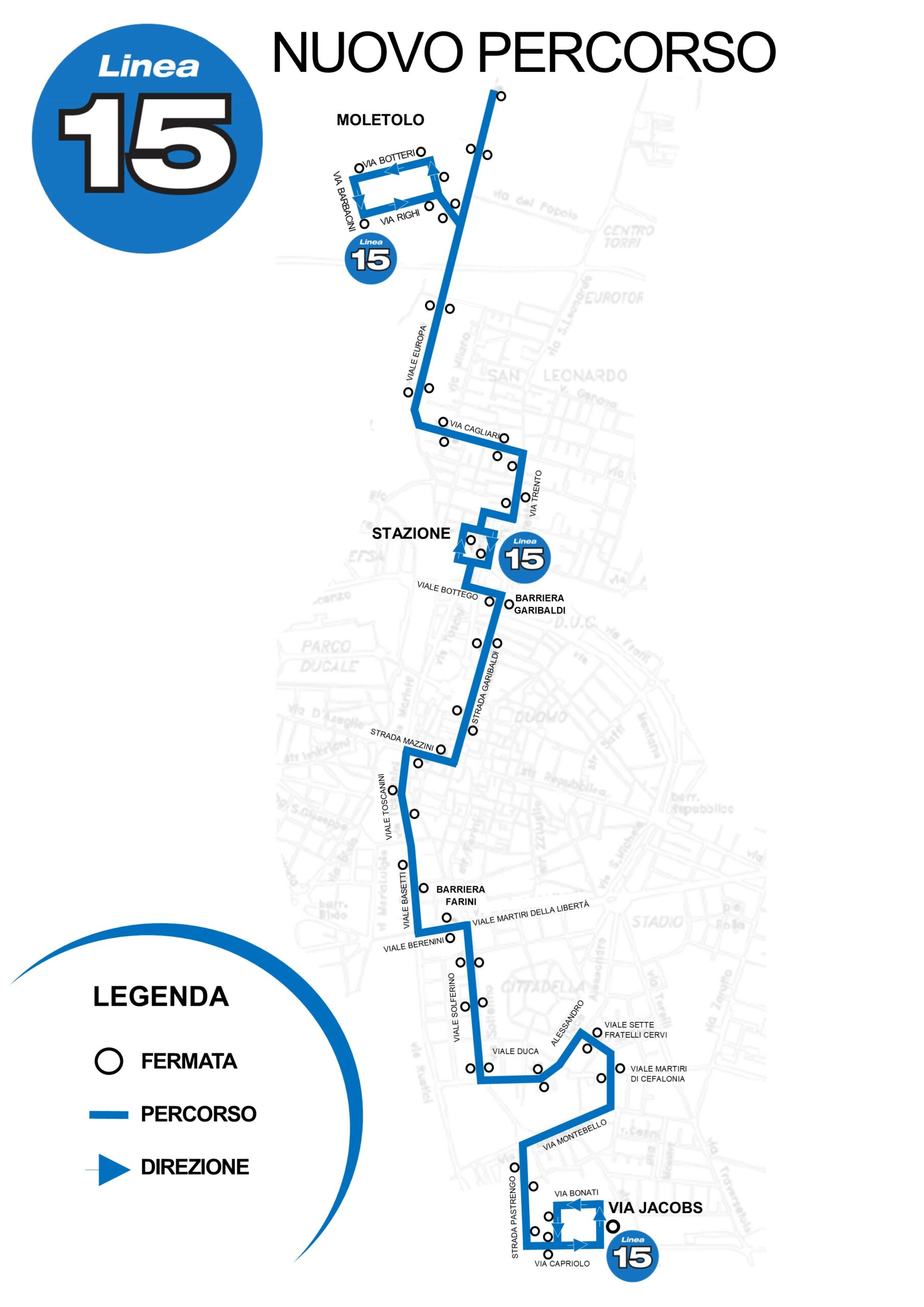 - a seguire, la linea 15 attraverserà viale Duca Alessandro e viale Solferino, evitando l’anello nord-est della Cittadella (via Racagni e viale delle Rimembranze).